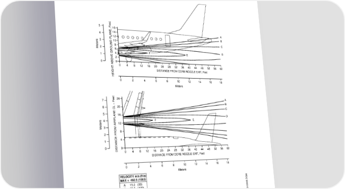 AIRPORT PLANNING MANUAL 6.1. ENGINE EXHAUST VELOCITIES AND TEMPERATURES TAKEOFF POWER, SEA LEVEL, Tamb = ISA +16.7°C, FNIN1 = 63685 N (14317 lbf) 5 16 14 A 4 12 B 3 10 C 2 8 Meters 6 D 1 4 F E 2 0 0 04812162024283236404448525660 DISTANCE FROM CORE NOZZLE EXIT, Feet HEIGHT ABOVE GROUND PLANE, Feet 024681012141618 Meters 7 24 A B 6 20 C 5 16 D 4 12 F E Meters3 2 8 1 4 0 DISTANCE FROM AIRPLANE CL − Feet0 04812162024283236404448525660 DISTANCE FROM CORE NOZZLE EXIT, Feet 024681012141618 Meters VELOCITY m/s (ft/s) MAX = 482.5 (1583) A 15.2 (50) B 30.5 (100) C 60.9 (200) D 121.9 (400) E 243.8 (800) F 457.2 (1500) NOTE: EXHAUST VELOCITY CONTOURS INCLUDE WORST CASE 20 kn HEADWIND WITH GROUND EFFECTS. EM170MFEP010005.DGN Jet Wake Velocity Profile - Takeoff Power Figure 6.1 EFFECTIVITY: ALL Section 6 Page 6-2 Dec08/03 b-apm1346