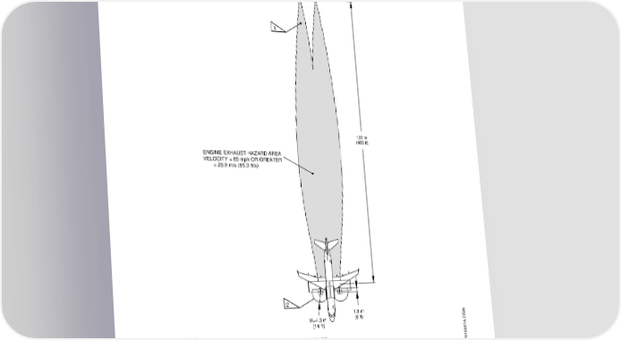 AIRPORT PLANNING MANUAL 6.3. HAZARDAREAS TAKEOFF POWER, SEA LEVEL, Tamb = ISA +16.7° C, FNIN1 = 63685 N (14317 lbf) 1 132 m (433 ft) ENGINE EXHAUST HAZARD AREA VELOCITY = 65 mph OR GREATER = 29.0 m/s (95.3 ft/s) 2 1.8 m R=4.3 m (6 ft) (14 ft) NOTE: NO ACCESS TO ENGINE ACCESSORIES AT TAKEOFF POWER. 1 EXHAUST HAZARD AREA − CONDITION: 20 kn HEADWIND WITH GROUND EFFECTS. 2 INLET HAZARD AREA − CONDITION: 20 kn HEADWIND/CROSSWIND BASED ON 12.2 m/s (40 ft/s) CRITICAL VELOCITY WITH 0.9 m (3 ft) CONTINGENCY FACTOR. EM170MFEP010001A.DGN Hazard Areas - Takeoff Power Figure 6.7 EFFECTIVITY: ALL Section 6 Page 6-9 Jan 09/06 w-apm1346