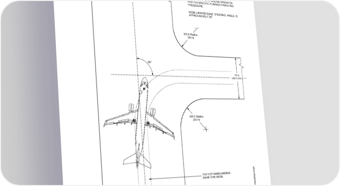AIRPORT PLANNING MANUAL NOTE: 30 m COORDINATE WITH AIRLINE OPERATOR (98 ft 5 in.) FOR THE SPECIFIC PLANNED OPERATING PROCEDURE. NOSE LANDING GEAR STEERING ANGLE IS APPROXIMATELY 30. 100 ft Radius (30 m) 90° 15 m (49 ft 2 in.) 100 ft Radius (30 m) PATH OF MAIN LANDING GEAR TIRE EDGE. EM170APM040003.DGN 90° Turn - Runway to Taxiway Figure 4.5 EFFECTIVITY: ALL Section 4 Page 4-7 Dec08/03 b-apm1346