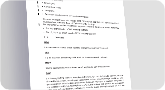 AIRPORT PLANNING MANUAL 2. AIRCRAFT DESCRIPTION 2.1. AIRCRAFT CHARACTERISTICS The aircraft is: • Predominantly metallic; • Low winged; • Conventional tailed; • Monoplane; • Retractable tricycle-type with twin-wheeled landing-gear. There are two high bypass ratio turbofan GEAE CF34–8E with 63.2 kN (14200 lbf) maximum takeoff thrust (sea level, static and ISA + 15 °C) installed under the wings. Theaircraft has two versions, with different ranges as a function of the difference between the MTOWs: • The STD aircraft model - MTOW 35990 kg (79344 lb) • The LR, SU or SE aircraft models - MTOW 37200 kg (82012 lb) 2.1.1. Definitions MRW It is the maximum allowed aircraft weight for taxiing or maneuvering on the ground. MLW It is the maximum allowed weight with which the aircraft can normally be landed. MTOW It is the maximum allowed total loaded aircraft weight at the start of the takeoff run. BOW It is the weight of the structure, powerplant, instruments, flight controls, hydraulic, electronic, electrical, air conditioning, oxygen, anti-icing and pressurization systems, interior furnishings, portable and emer- gency equipment and other items of equipment that are an integral part of the aircraft configuration. It also includes unusable fuel, total engine and APU oil, total hydraulic fluid, toilet fluid and water, potable water, crew and crew baggage, navigation kit (manuals, charts), catering (beverages and food) and removable service equipment for the galley. MZFW It is the maximum allowed weight without usable fuel in the tanks. EFFECTIVITY: ALL Section 2 Page 2-1 Oct 07/08 w-apm1346