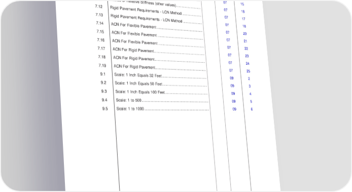 AIRPORT PLANNING MANUAL FIGURE TITLE SHEET SECTION PAGE 7.9 Rigid Pavement Requirements - Portland Cement Associa- tion Design Method............................................................... 07 13 7.10 Radius of Relative Stiffness.................................................. 07 15 7.11 Radius of Relative Stiffness (other values)........................... 07 16 7.12 Rigid Pavement Requirements - LCN Method..................... 07 17 7.13 Rigid Pavement Requirements - LCN Method..................... 07 18 7.14 ACNFor Flexible Pavement................................................. 07 20 7.15 ACNFor Flexible Pavement................................................. 07 21 7.16 ACNFor Flexible Pavement................................................. 07 22 7.17 ACNFor Rigid Pavement...................................................... 07 23 7.18 ACNFor Rigid Pavement...................................................... 07 24 7.19 ACNFor Rigid Pavement...................................................... 07 25 9.1 Scale: 1 Inch Equals 32 Feet................................................ 09 2 9.2 Scale: 1 Inch Equals 50 Feet................................................ 09 3 9.3 Scale: 1 Inch Equals 100 Feet.............................................. 09 4 9.4 Scale: 1 to 500...................................................................... 09 5 9.5 Scale: 1 to 1000.................................................................... 09 6 EFFECTIVITY: ALL LIST OF FIGURES Page 3 / 4 w-apm1346 Oct 31/12