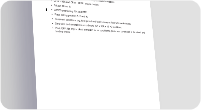 AIRPORT PLANNING MANUAL 3.3. TAKEOFF FIELD LENGTHS Thetakeoff performance is based on the requirements of JAR 25, Change 14, plus amendment 25/96/1. Thetakeoff field length charts provide data about the maximum takeoff weights, for compliance with the operating regulations relating to takeoff field lengths. Data are presented according to the following associated conditions: • CF34 - 8E5 and CF34 - 8E5A1 engine models; • Takeoff Mode: 1; • ATTCS positioning: ON and OFF; • Flaps setting position: 1, 2 and 4; • Pavement conditions: dry, hard paved and level runway surface with no obstacles; • Zero wind and atmosphere according to ISA or ISA + 15 °C conditions; • Pack OFF: No engine bleed extraction for air conditioning packs was considered in the takeoff and landing charts. EFFECTIVITY: ALL Section 3 Page 3-7 Oct 31/12 w-apm1346