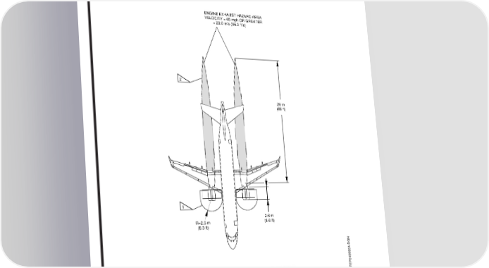 AIRPORT PLANNING MANUAL GROUND IDLE, SEA LEVEL, Tamb = ISA+16.7° C, FNIN1 = 3785 N (851 lbf) ENGINE EXHAUST HAZARD AREA VELOCITY = 65 mph OR GREATER = 29.0 m/s (95.3 ft/s) 2 26 m (86 ft) 1 2.6 m R=2.5 m (8.6 ft) (8.3 ft) 1 INLET HAZARD AREA − CONDITION: 20 kn HEADWIND/CROSSWIND/TAILWIND BASED ON 12.2 m/s (40 ft/s) CRITICAL VELOCITY WITH 0.9 m (3 ft) CONTINGENCY FACTOR. 2 EXHAUST HAZARD AREA − CONDITION: 20 kn HEADWIND WITH GROUND EFFECTS. EM170MFEP010002A.DGN Hazard Areas - Ground Idle Figure 6.8 EFFECTIVITY: ALL Section 6 Page 6-10 Oct 07/10 w-apm1346