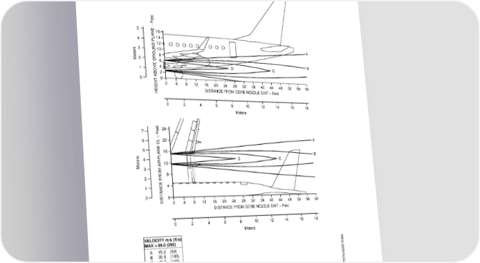 AIRPORT PLANNING MANUAL GROUND IDLE, SEA LEVEL, Tamb = ISA +16.7°C, FNIN1 = 3785 N (851 lbf) 5 16 4 14 12 A 3 10 2 8 Meters 6 B 1 4 D C 2 0 0 04812162024283236404448525660 HEIGHT ABOVE GROUND PLANE − FeetDISTANCE FROM CORE NOZZLE EXIT − Feet 024681012141618 Meters 7 24 6 20 A 5 16 B 4 D C 12 Meters3 2 8 1 4 0 0 DISTANCE FROM AIRPLANE CL − Feet04812162024283236404448525660 DISTANCE FROM CORE NOZZLE EXIT − Feet 024681012141618 Meters VELOCITY m/s (ft/s) MAX = 89.0 (292) A 15.2 (50) B 30.5 (100) C 45.7 (150) D 76.2 (250) NOTE: EXHAUST VELOCITY CONTOURS INCLUDE WORST CASE 20 kn HEADWIND WITH GROUND EFFECTS. EM170MFEP010007.DGN Jet Wake Velocity Profile - Ground Idle Figure 6.3 EFFECTIVITY: ALL Section 6 Page 6-4 Dec08/03 b-apm1346