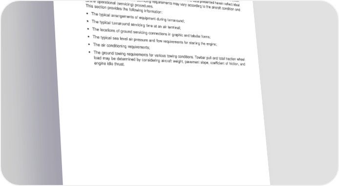 AIRPORT PLANNING MANUAL 5. TERMINAL SERVICING During turnaround at the air terminal, certain services must be performed on the aircraft, usually within a given time to meet flight schedules. This section shows service vehicle arrangements, schedules, locations of servicing points, and typical servicing requirements. The data presented herein reflect ideal conditions for a single aircraft. Servicing requirements may vary according to the aircraft condition and airline operational (servicing) procedures. This section provides the following information: • The typical arrangements of equipment during turnaround; • The typical turnaround servicing time at an air terminal; • The locations of ground servicing connections in graphic and tabular forms; • The typical sea level air pressure and flow requirements for starting the engine; • The air conditioning requirements; • The ground towing requirements for various towing conditions. Towbar pull and total traction wheel load may be determined by considering aircraft weight, pavement slope, coefficient of friction, and engine idle thrust. EFFECTIVITY: ALL Section 5 Page 5-1 Dec08/03 b-apm1346
