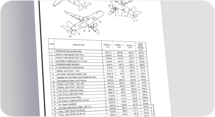 AIRPORT PLANNING MANUAL 1 2 4 5 8 9 12 6 3 7 10 11 14 13 15 16 17 18 19 20 21 22 COORD. Y HEIGHT ITEM DESCRIPTION COORD. X (mm) COORD. Z ABOVE (mm) (mm) GROUND (mm) 1 PRESSURE REFUELING PANEL 13491.27 5702.96 −623.30 2461.54 2 GRAVITY REFUELING PORT (RH) 14789.49 7413.99 −243.75 2830.76 GRAVITY REFUELING PORT (LH) 14789.49 −7413.99 −243.75 2830.76 3 4 EXTERNAL POWER SUPPLY 115 VAC 4146.90 −810.70 −1339.53 1819.58 5 FORWARD RAMP HEADSET 4164.44 −936.13 −1262.71 1896.25 6 STEERING SWITCH DISENGAGE 4136.97 −951.46 −1279.29 1879.90 7 WHEEL JACK POINT − NLG 4112.77 0.00 −2942.27 217.16 8 AIR COND. GROUND CONNECTION 10487.32 80.00 −1979.71 1129.04 9 ENGINE AIR STARTING (LOW PRESSURE UNIT) 10778.80 4.28 −2010.20 1096.23 10 GROUNDING POINT (ELECTRICAL) 14592.10 2560.25 −1343.60 1732.52 11 WHEEL JACK POINT− MLG (RH) 14475.49 2600.00 −2662.17 414.90 12 WHEEL JACK POINT− MLG (LH) 14475.49 −2600.00 −2662.17 414.90 13 HYD. SYS # 1 SERVICE PANEL 16560.17 −808.01 −1602.04 1458.44 14 HYD. SYS # 2 SERVICE PANEL 16560.17 808.01 −1602.04 1458.44 15 WATER SERVICING PANEL 21524.83 −329.37 −1178.74 1842.28 16 EXTERNAL POWER SUPPLY 28 VDC 24084.65 −471.73 −605.30 2395.36 17 AFT RAMP HEADSET 24225.26 −449.47 −585.54 2414.01 18 OXYGEN SERVICING PANEL / BOTTLE 6562.14 1159.87 −961.05 2178.86 19 FUEL TANK DRAIN VALVE (RH) 13352.80 398.47 −1413.71 1672.25 20 FUEL TANK DRAIN VALVE (LH) 13352.80 −398.47 −1413.71 1672.25 21 WASTE SERVICING PANEL 22447.01 349.20 −991.80 2021.88 22 HYD. SYS # 3 SERVICE PANEL 24061.86 519.15 −590.09 2410.75 NOTE: THE GROUND CLEARANCES IN THE TABLE REFER TO THE AIRCRAFT WITH THE MINIMUM EM170APM050006A.DGN OPERATING WEIGHT (MOW) = 21800 kg (CG REAR 27.0% CMA) Ground Servicing Connections Figure 5.5 EFFECTIVITY: ALL Section 5 Page 5-8 May11/07 w-apm1346