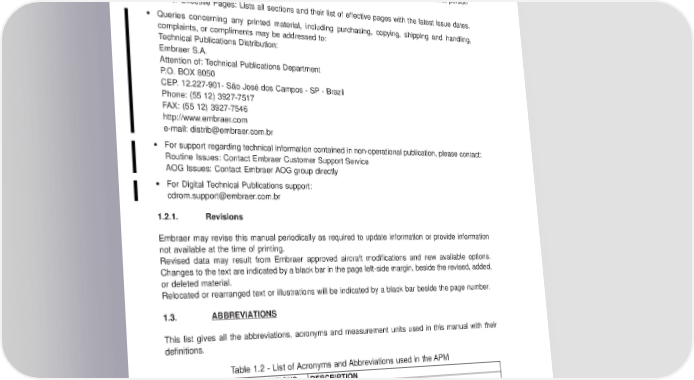 AIRPORT PLANNING MANUAL List of Service Bulletins: Lists the Service Bulletins, including all issued revisions, which affect the • manual as well as the affected section(s) (APM Section Number), the aircraft affected by the Service Bulletin, and the date of incorporation of the SB in the manual. • Temporary Revision Sheet: Lists the temporary revision numbers, page number, issue date, person responsible for the insertion and insertion date. • List of Effective Pages: Lists all sections and their list of effective pages with the latest issue dates. • Queries concerning any printed material, including purchasing, copying, shipping and handling, complaints, or compliments may be addressed to: Technical Publications Distribution: Embraer S.A. Attention of: Technical Publications Department P.O. BOX 8050 CEP. 12.227-901- São José dos Campos - SP - Brazil Phone: (55 12) 3927-7517 FAX: (55 12) 3927-7546 http://www.embraer.com e-mail: [email protected] • For support regarding technical information contained in non-operational publication, please contact: Routine Issues: Contact Embraer Customer Support Service AOGIssues: Contact Embraer AOG group directly • For Digital Technical Publications support: [email protected] 1.2.1. Revisions Embraer may revise this manual periodically as required to update information or provide information not available at the time of printing. Revised data may result from Embraer approved aircraft modifications and new available options. Changestothetext are indicated by a black bar in the page left-side margin, beside the revised, added, or deleted material. Relocated or rearranged text or illustrations will be indicated by a black bar beside the page number. 1.3. ABBREVIATIONS This list gives all the abbreviations, acronyms and measurement units used in this manual with their definitions. Table 1.2 - List of Acronyms and Abbreviations used in the APM ACRONYMSANDABBREVIATIONS DESCRIPTION °C Degree Celsius °F Degree Fahrenheit Liter ACN Aircraft Classification Number AFM Airplane Flight Manual AOM Airplane Operations Manual EFFECTIVITY: ALL Section 1 Page 1-2 Oct 06/11 w-apm1346
