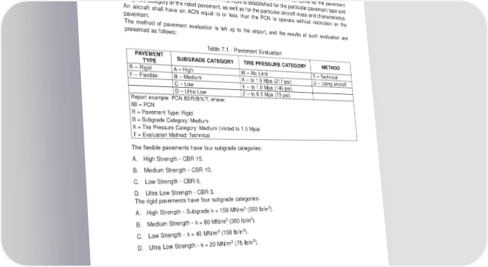 AIRPORT PLANNING MANUAL 7.9. ACN-PCNSYSTEM-FLEXIBLEANDRIGIDPAVEMENTS The ACN/PCN system as referenced in Amendment 35 to ICAO Annex 14, “Aerodromes”, provides a standardized international aircraft/pavement rating system. The PCN is an index rating of the mass that according to evaluation can be borne by the pavement when applied by a standard single wheel. The ACN is established for the particular pavement type and subgrade category of the rated pavement, as well as for the particular aircraft mass and characteristics. An aircraft shall have an ACN equal to or less than the PCN to operate without restriction on the pavement. The method of pavement evaluation is left up to the airport, and the results of such evaluation are presented as follows: Table 7.1 - Pavement Evaluation PAVEMENT SUBGRADECATEGORY TIRE PRESSURE CATEGORY METHOD TYPE R–Rigid A–High W–NoLimit T – Technical F – Flexible B–Medium X–to1.5 Mpa (217 psi) U–Using aircraft C–Low Y–to1.0 Mpa (145 psi) D–Ultra Low Z – to 0.5 Mpa (73 psi) Report example: PCN 80/R/B/X/T, where: 80 = PCN R=PavementType: Rigid B=Subgrade Category: Medium X=Tire Pressure Category: Medium (limited to 1.5 Mpa) T=Evaluation Method: Technical The flexible pavements have four subgrade categories: A. High Strength - CBR 15. B. Medium Strength - CBR 10. C. Low Strength - CBR 6. D. Ultra Low Strength - CBR 3. The rigid pavements have four subgrade categories: 3 3 A. High Strength - Subgrade k = 150 MN/m (550 lb/in ). 3 3 B. Medium Strength - k = 80 MN/m (300 lb/in ). 3 3 C. Low Strength - k = 40 MN/m (150 lb/in ). 3 3 D. Ultra Low Strength - k = 20 MN/m (75 lb/in ). EFFECTIVITY: ALL Section 7 Page 7-19 Dec08/03 b-apm1346
