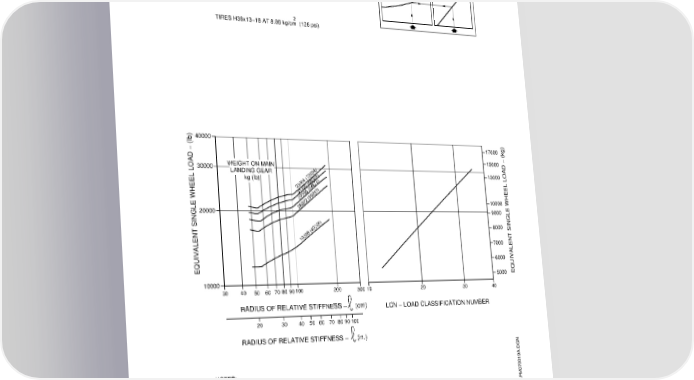 AIRPORT PLANNING MANUAL 2 TIRES H38x13−18 AT 8.86 kg/cm (126 psi) 40000 17000 WEIGHT ON MAIN 15000 30000 LANDING GEAR 13000 kg (lb) 33064 (72894) 31400 (69225) 29336 (64675) 10000 20000 26892 (59287) 9000 8000 19398 (42765) 7000 6000 EQUIVALENT SINGLE WHEEL LOAD − (lb) EQUIVALENT SINGLE WHEEL LOAD − (kg) 5000 10000 30 40 50 60 70 80 90100 200 300 10 20 30 40 RADIUS OF RELATIVE STIFFNESS − (cm) LCN − LOAD CLASSIFICATION NUMBER 20 30 40 50 60 70 80 90100 RADIUS OF RELATIVE STIFFNESS − (in.) NOTES: EQUIVALENT SINGLE WHEEL LOADS ARE DERIVED BY METHODS SHOWN IN ICAO AERODROME MANUAL. PART 2, PAR. 4.1.3 EM170APM070019A.DGN Rigid Pavement Requirements - LCN Method Figure 7.12 EFFECTIVITY: EMBRAER 170 STD ACFT Section 7 MODEL Page 7-17 Dec08/03 b-apm1346
