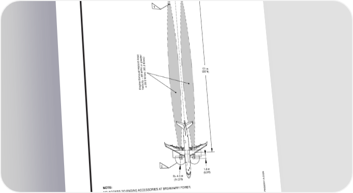 AIRPORT PLANNING MANUAL BREAKAWAY POWER, SEA LEVEL, Tamb = ISA +16.7° C, FNIN1 = 2328 DAN (5233 lbf) 1 121 m (397 ft) Engine Exhaust Hazard AreaVelocity = 65 MPH or greater= 29.0 M/sec (95.3 ft/sec) 2 1.8 m R= 4.3 m (6.0 ft) (14.0 ft) NOTE: NO ACCESS TO ENGINE ACCESSORIES AT BREAKAWAY POWER. 1 EXHAUST HAZARD AREA − CONDITION: 20 knot HEADWIND WITH GROUND EFFECTS. 2 INLET HAZARD AREA − CONDITION: 20 knot HEADWIND/CROSSWIND BASED ON 40 ft/sec CRITICAL VELOCITY WITH 0.9 m (3 ft) CONTINGENCY FACTOR. EM170APM060011A.DGN Hazard Areas - Breakaway Power Figure 6.9 EFFECTIVITY: ALL Section 6 Page 6-11 / 12 Oct 07/10 w-apm1346
