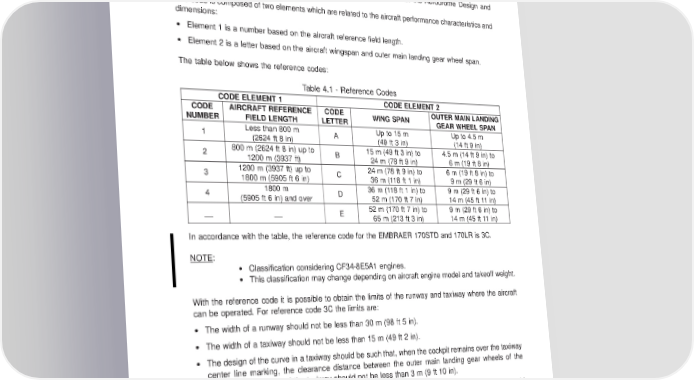 AIRPORT PLANNING MANUAL 4.5. RUNWAYANDTAXIWAYDIMENSIONS To determine the minimum dimensions for runway and taxiway where the aircraft can be operated, the reference code of the aircraft must be determined. The reference code of a specific aircraft is obtained in accordance with the Aerodrome Design and Operations - Volume 1, by the ICAO. Thecodeiscomposedoftwoelementswhicharerelatedtotheaircraft performance characteristics and dimensions: • Element 1 is a number based on the aircraft reference field length. • Element 2 is a letter based on the aircraft wingspan and outer main landing gear wheel span. The table below shows the reference codes: Table 4.1 - Reference Codes CODEELEMENT1 CODEELEMENT2 CODE AIRCRAFT REFERENCE CODE WINGSPAN OUTERMAINLANDING NUMBER FIELD LENGTH LETTER GEARWHEELSPAN 1 Less than 800 m A Up to 15 m Up to 4.5 m (2624 ft 8 in) (49 ft 3 in) (14 ft 9 in) 2 800 m (2624 ft 8 in) up to B 15 m (49 ft 3 in) to 4.5 m (14 ft 9 in) to 1200 m (3937 ft) 24 m (78 ft 9 in) 6 m (19 ft 8 in) 3 1200 m (3937 ft) up to C 24 m (78 ft 9 in) to 6 m (19 ft 8 in) to 1800 m (5905 ft 6 in) 36m(118ft1in) 9 m (29 ft 6 in) 4 1800 m D 36m(118ft1in)to 9 m (29 ft 6 in) to (5905 ft 6 in) and over 52 m (170 ft 7 in) 14 m (45 ft 11 in) __ __ E 52 m (170 ft 7 in) to 9 m (29 ft 6 in) to 65 m (213 ft 3 in) 14 m (45 ft 11 in) In accordance with the table, the reference code for the EMBRAER 170STD and 170LR is 3C. NOTE: • Classification considering CF34-8E5A1 engines. • This classification may change depending on aircraft engine model and takeoff weight. With the reference code it is possible to obtain the limits of the runway and taxiway where the aircraft can be operated. For reference code 3C the limits are: • The width of a runway should not be less than 30 m (98 ft 5 in). • The width of a taxiway should not be less than 15 m (49 ft 2 in). • Thedesign of the curve in a taxiway should be such that, when the cockpit remains over the taxiway center line marking, the clearance distance between the outer main landing gear wheels of the aircraft and the edge of the taxiway should not be less than3m(9ft10in). • The clearance between a parked aircraft and one moving along the taxiway in a holding bay should not be less than 15 m (49 ft 3 in). EFFECTIVITY: ALL Section 4 Page 4-5 Oct 07/08 w-apm1346