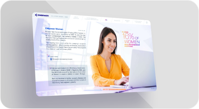 RELATÓRIO ANUAL / 2022 ABOUT FIT FOR GROWTH & ESESGG INNOVATION BUSINESS SUSTAINABILITY EMBRAER FINANCIAL PERFORMANCE UNIT INDICATORS EMpower Women GRI 401; 404; 405 In 2022 Embraer has the corporate goal of having 20% of women in the company’s senior leadership by 2025. To pave the way 16% for such achievement, the company created, in 2022, the OF Women’s Training Program with a focus on accelerating the development of their careers. WOMEN This training takes place within the company’s corporate HELD MANAGEMENT training platform, which provides continuous development POSITIONS programs and training for the entire company. The program’s 昀椀rst class will start in February 2023. Learn more: Ecosystem Accelerating Careers Embraer participated in the 33rd Annual Conference of Women in Aviation (WAI) in Nashville, USA, and the 34th Conference of the International Association of Women in Aviation (IAWA) in Lisbon, Portugal. Both events aimed to further, support, discuss, and expand the presence of women and their careers in this mostly male segment, globally. 2626