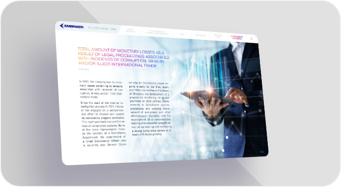 RELATÓRIO ANUAL / 2022 ABOUT FIT FOR GROWTH & ESG INNOVATION BUSINESS SUSUSSTTAINABILAINABILITITYY EMBRAER FINANCIAL PERFORMANCE UNIT INDICINDICAATTORORS S TOTAL AMOUNT OF MONETARY LOSSES AS A RESULT OF LEGAL PROCEEDINGS ASSOCIATED WITH INCIDENTS OF CORRUPTION, BRIBERY, AND/OR ILLICIT INTERNATIONAL TRADE (RT-AE-510a.1) In 2022, the company had no pecu- sel who for Compliance issues re- niary losses pertaining to lawsuits ports directly to the Risk, Audit associated with incidents of cor- and Ethics Committee of the Board ruption, bribery and/or illicit inter- of Directors; the development of a national trade. process for monitoring hiring and Since the start of the internal in- payments to third parties; impro- vestigation process in 2011, Embra- vements in Compliance policies, er has engaged on a comprehen- procedures, and controls; impro- sive effort to improve and expand vement of anonymous and other its compliance program worldwide. whistleblower channels; and the This multi-year task involved the re- development of a comprehensive view of compliance systems. Some training and education program ai- of the main improvements inclu- med at maintaining and reinforcing de the creation of a Compliance a strong Compliance culture at all Department; the appointment of levels of Embraer globally. a Chief Compliance Of昀椀cer who is currently also General Coun- 135