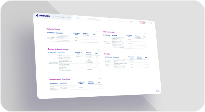 RELATÓRIO ANUAL / 2022 ABOUT FIT FOR GROWTH & ESG INNOVATION BUSINESS SUSUSSTTAINABILAINABILITITYY EMBRAER FINANCIAL PERFORMANCE UNIT INDICINDICAATTORORS S Material Topics GRI 3 Anti-corruption GRI 205 GRI STANDARD DISCLOSURE Sustainability Additional SDG GRI STANDARD DISCLOSURE Sustainability Additional SDG Report Reference(s) Report Reference(s) 3-1 Process to determine Page 71 205-1 Operations assessed for Page 132 16 GRI 3: Material material topics risks related to corruption Topics 2021 3-2 List of material topics Page 71 205-2 Communication and GRI 205: Anti- training about anti-corruption Page 133 16 corruption 2016 policies and procedures 205-3 Con昀椀rmed incidents of Page 134 16 corruption and actions taken Economic Performance GRI 201 GRI STANDARD DISCLOSURE Sustainability Additional SDG Energy Report Reference(s) 201-1 Direct economic value Page 12 to 14 Results Center 8,9 GRI STANDARD DISCLOSURE Sustainability Additional SDG generated and distributed Report Reference(s) 201-2 Financial implications CDP - GRI 3: Material 3-3 Management of material and other risks and - C2. Risks and 13 Topics 2021 topics Page 16 to 18 opportunities due to climate Opportunities GRI 201: Economic change C3. Business Strategy 302-1 Energy consumption within Performance 2016 201-3 De昀椀ned bene昀椀t the organization Page 75 7, 8, 12, 13 GRI 302 - Energy plan obligations and other - Report 20-F 8, 9 2016 302-2 Energy consumption retirement plans outside of the organization Page 77 7, 8, 12, 13 201-4 Financial assistance - Report 20-F received from government Procurement Practices GRI 204 GRI STANDARD DISCLOSURE Sustainability Additional SDG Report Reference(s) GRI 204: 204-1 Proportion of spending on Procurement local suppliers Page 123 8 Practices 2016 152