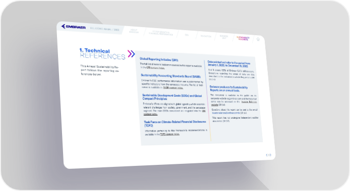 RELATÓRIO ANUAL / 2022 ABOUT FIT FOR GROWTH & ESG INNOVATION BUSINESS SUSUSSTTAINABILAINABILITITYY EMBRAER FINANCIAL PERFORMANCE UNIT INDICINDICAATTORORS S 1. Technical REFERENCES Global Reporting Initiative (GRI): Data pointed out refer to the period from The full list of material indicators covered in this report is available January 1, 2022, to December 31, 2022 This Annual Sustainability Re- in the GRI content index. And it covers 100% of Embraer S.A.’s collaborators. port follows the reporting re- Exceptions regarding the scope of data are duly ferences below: Sustainability Accounting Standards Board (SASB): described in the indicators to which they pertain. (GRI 2-2; 2-3) Embraer’s ESG performance information was supplemented by speci昀椀c indicators from the aerospace industry. The list of indi- Embraer produces its Sustainability cators is available in SASB content index. Reports on an annual basis. Sustainable Development Goals (SDGs) and Global The document is available to the public on its Compact Principles: corporate website esg.embraer.com and the historical series can be accessed on the Investor Relations Embraer’s efforts are aligned with global agendas, which assemble website (GRI 2-3) relevant challenges from society, government, and the aerospace Questions about this report can be sent to the e-mail segment. The main SDGs considered are integrated into the GRI [email protected] (GRI 2-3) content index. This report has not undergone independent auditor Task Force on Climate-Related Financial Disclosures assurance (GRI 2-5). (TCFD) Information pertaining to this framework’s recommendations is available in the TCFD content index. 70