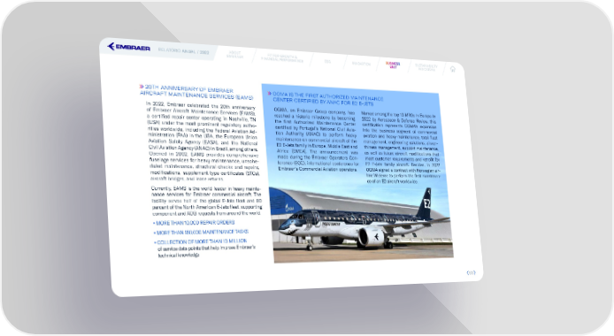RELATÓRIO ANUAL / 2022 ABOUT FIT FOR GROWTH & ESG INNOVATION BUBUSINESINESSSS SUSTAINABILITY EMBRAER FINANCIAL PERFORMANCE UNITUNIT INDICATORS 20TH ANNIVERSARY OF EMBRAER OGMA IS THE FIRST AUTHORIZED MAINTENANCE AIRCRAFT MAINTENANCE SERVICES (EAMS) CENTER CERTIFIED BY ANAC FOR E2 E-JETS In 2022, Embraer celebrated the 20th anniversary OGMA, an Embraer Group company, has Named among the top 10 MROs in Europe in of Embraer Aircraft Maintenance Services (EAMS), reached a historic milestone by becoming 2022 by Aerospace & Defense Review, this a certi昀椀ed repair center operating in Nashville, TN the 昀椀rst Authorized Maintenance Center certi昀椀cation represents OGMA’s expansion (USA) under the most prominent regulatory autho- certi昀椀ed by Portugal’s National Civil Avia- into the business segment of commercial rities worldwide, including the Federal Aviation Ad- tion Authority (ANAC) to perform heavy aviation and heavy maintenance, total 昀氀eet ministration (FAA) in the USA, the European Union maintenance on commercial aircraft of the management, engineering solutions, airwor- Aviation Safety Agency (EASA), and the National E2 E-Jets family in Europe, Middle East and thiness management, support maintenance, Civil Aviation Agency (ANAC) in Brazil, among others. Africa (EMEA). The announcement was as well as future aircraft modi昀椀cations that Opened in 2002, EAMS provides comprehensive made during the Embraer Operators Con- meet customer requirements and retro昀椀t for fuselage services for heavy maintenance, unsche- ference (EOC), international conference for E2 E-Jets family aircraft. Besides, in 2022 duled maintenance, structural checks and repairs, Embraer’s Commercial Aviation operators. OGMA signed a contract with Norwegian air- modi昀椀cations, supplement type certi昀椀cates (STCs), line Widerøe to perform the 昀椀rst maintenan- aircraft bridges, and lease returns. ce of an E2 aircraft worldwide. Currently, EAMS is the world leader in heavy mainte- nance services for Embraer commercial aircraft. The facility serves half of the global E-Jets 昀氀eet and 80 percent of the North American E-Jets 昀氀eet, supporting component and AOG requests from around the world. • MORE THAN 10,000 REPAIR ORDERS • MORE THAN 180,000 MAINTENANCE TASKS • C OLLECTION OF MORE THAN 10 MILLION of service data points that help improve Embraer’s technical knowledge 63