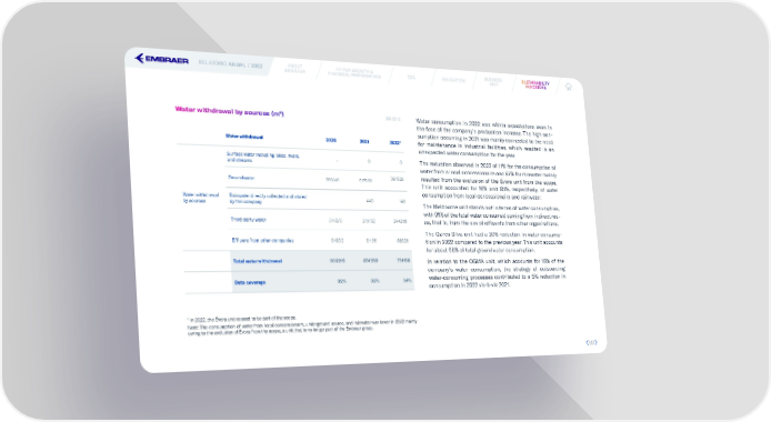ABOUT BUSINESS SUSTAINABILITY RELATÓRIO ANUAL / 2022 FIT FOR GROWTH & ESG INNOVATION SUSTAINABILITY EMBRAER UNIT INDICATORS FINANCIAL PERFORMANCE INDICATORS 3 (GRI 303-3) Water withdrawal by sources (m ) Water consumption in 2022 was within expectations even in the face of the company’s production increase. The high con- sumption occurring in 2021 was mainly connected to the need Water withdrawal 2020 2021 2022* for maintenance in industrial facilities, which resulted in an unexpected water consumption for the year. Surface water including lakes, rivers, - 0 0 The reduction observed in 2022 of 11% for the consumption of and streams water from a local concessionaire and 67% for rainwater mainly Groundwater 393146 517569 397825 resulted from the exclusion of the Évora unit from the scope. This unit accounted for 16% and 65%, respectively, of water Water withdrawal Rainwater directly collected and stored consumption from local concessionaire and rainwater. by sources by the company - 443 148 The Melbourne unit stands out in terms of water consumption, with 91% of the total water consumed coming from indirect reu- Third-party water 314270 275182 244258 se, that is, from the use of ef昀氀uents from other organizations. The Ozires Silva unit had a 30% reduction in water consump- Ef昀氀uent from other companies 94803 81156 88925 tion in 2022 compared to the previous year. This unit accounts for about 56% of total groundwater consumption. Total water withdrawal 802219 874350 731156 In relation to the OGMA unit, which accounts for 18% of the company’s water consumption, the strategy of outsourcing Data coverage 92% 92% 94% water-consuming processes contributed to a 5% reduction in consumption in 2022 vis-à-vis 2021. * In 2022, the Évora unit ceased to be part of the scope. Note: The consumption of water from local concessionaire, underground source, and rainwater was lower in 2022 mainly owing to the exclusion of Évora from the scope, a unit that is no longer part of the Embraer group. 83