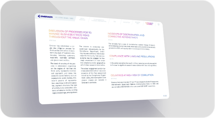 RELATÓRIO ANUAL / 2022 ABOUT FIT FOR GROWTH & ESG INNOVATION BUSINESS SUSUSSTTAINABILAINABILITITYY EMBRAER FINANCIAL PERFORMANCE UNIT INDICINDICAATTORORS S DISCUSSION OF PROCESSES FOR TO INCIDENTS OF DISCRIMINATION AND MANAGE BUSINESS ETHICS RISKS CORRECTIVE ACTIONS TAKEN THROUGHOUT THE VALUE CHAIN (GRI 406-1) (RT-AE-510a.3) The company had a case of discrimination received through Embraer’s whistleblowing channel (Helpline), which was quickly ascertained as actually Embraer has established a sin- The process is conducted and grounded in 2022, with appropriate measures applied immediately. gle due diligence process for supervised independently by the third parties with which it main- Compliance Department, which tains any type of business rela- may request additional information tionship, including customers, about the third party. External con- COMPLIANCE WITH LAWS AND REGULATIONS suppliers, business partners, sultants may be engaged for tho- (GRI 2-27) and government entities. rough assessment in more sensi- The level of scrutiny of the pro- tive situations and/or geographies In the period covered by this report, no 昀椀ne or pecuniary penalty was applied cess is established depending with limited access to information. to Embraer for signi昀椀cant cases of noncompliance with laws and regulations. on the degree of risk that the The actual engagement and/or bu- third party represents (risk-ba- siness establishment will be a con- sed approach), and takes into sequence of the 昀椀nal assessment account several factors, such as issued by the Compliance Depart- COUNTRIES AT HIGH RISK OF CORRUPTION exposure to public bodies, Em- ment. Lastly, Anti-Corruption Com- (RT-AE-510a.2) braer’s powers of representa- pliance clauses are included in tion, countries in which it opera- Embraer’s contracts. Revenue from countries rated “E” and “F” according to the Band of Transparency tes, payment structure, the type International’s Government Defense Anti-Corruption Index in 2022 was of activity to be conducted, exis- approximately USD 534,685 million and about USD 85,187, respectively. tence of adverse media, existing legal proceedings, among others. 136