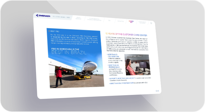 RELATÓRIO ANUAL / 2022 ABOUT FIT FOR GROWTH & ESG INNOVATION BUBUSINESINESSSS SUSTAINABILITY EMBRAER FINANCIAL PERFORMANCE UNITUNIT INDICATORS BEST FBO 10 YEARS OF THE CUSTOMER CARE CENTER For the third year in a row, Embraer’s FBO (昀椀xed-base operator) In 2012, Embraer launched the Customer Care Center, the result of is recognized as the best in Brazil, according to FBO 2022 survey, the uni昀椀cation of its regional Commercial Aviation customer service conducted by AIN (Aviation International News) magazine. Embraer’s centers. Celebrating ten years of operation in 2022, its scope will be FBO in Sorocaba is a center of excellence in aircraft support, offering broadened, covering executive and defense aircraft operators. From its hangar, cleaning, and supply, among many other services. headquarters in São José dos Campos, the Customer Care Center has a quali昀椀ed team of technicians, providing global support for coordination FBO IN SOROCABA IS THE of AOG events and scheduled aircraft maintenance assistance, from BEST IN BRAZIL the 昀椀rst contact to resolution. • MORE THAN 70 COLLABORATORS in the main duties of service and engineering solution projects; • MORE THAN 130 PROFESSIONALS working 24/7 to serve three business units – Commercial, Executive, and Defense; • SUPPORT TO MORE THAN 3,900 AIRCRAFT in operation and nearly 1,100 customers around the world; • MORE THAN 96% OF RESPONSE RATE to customers within SLA. 64