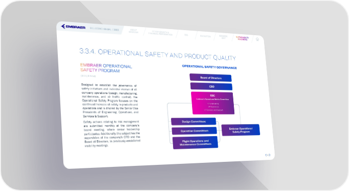 RELATÓRIO ANUAL / 2022 ABOUT FIT FOR GROWTH & ESG INNOVATION BUSINESS SUSUSSTTAINABILAINABILITITYY EMBRAER FINANCIAL PERFORMANCE UNIT INDICINDICAATTORORS S 3.3.4. OPERATIONAL SAFETY AND PRODUCT QUALITY EMBRAER OPERATIONAL OPERATIONAL SAFETY GOVERNANCE SAFETY PROGRAM (GRI 3-3; RT-AE-250) Board of Directors Designed to establish the governance of CEO safety initiatives and indicator reviews of all company operations (design, manufacturing, ESC maintenance, and air traf昀椀c control), the Embraer’s Operational Safety Committee Operational Safety Program focuses on the continued increase of safety in products and VP Engineering operations and is chaired by the Senior Vice VP Operations VP Services and Support Presidents of Engineering, Operations, and Services & Support. Safety actions relating to risk management Design Committees are submitted monthly at the company’s board meeting, where senior leadership Embraer Operational participates. Additionally, the subject has the Operation Committees Safety Program supervision of the company’s CEO and the Board of Directors, in previously established Flight Operations and visibility meetings. Maintenance Committees 140