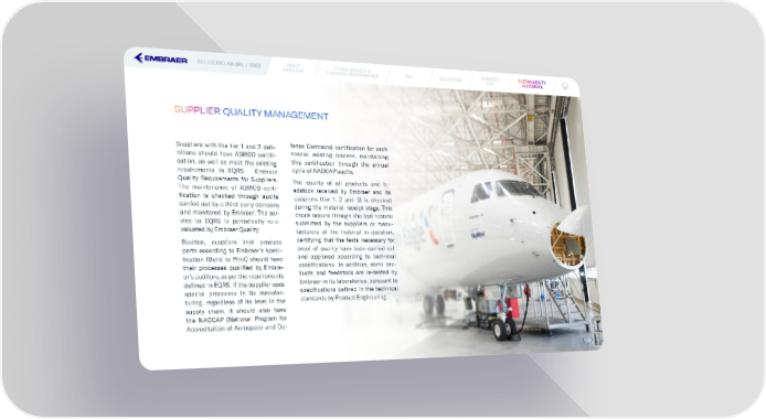RELATÓRIO ANUAL / 2022 ABOUT FIT FOR GROWTH & ESG INNOVATION BUSINESS SUSUSSTTAINABILAINABILITITYY EMBRAER FINANCIAL PERFORMANCE UNIT INDICINDICAATTORORS S SUPPLIER QUALITY MANAGEMENT Suppliers with the tier 1 and 2 de昀椀- fense Contracts) certi昀椀cation for each nitions should have AS9100 certi昀椀- special existing process, maintaining cation, as well as meet the existing this certi昀椀cation through the annual requirements in EQRS – Embraer cycle of NADCAP audits. Quality Requirements for Suppliers. The quality of all products and fe- The maintenance of AS9100 certi- edstock received by Embraer and its 昀椀cation is checked through audits suppliers (tier 1, 2 and 3) is checked carried out by a third party company during the material receipt stage. This and monitored by Embraer. The ser- check occurs through the test reports vice to EQRS is periodically re-e- submitted by the suppliers or manu- valuated by Embraer Quality. facturers of the material in question, Besides, suppliers that produce certifying that the tests necessary for parts according to Embraer’s speci- proof of quality have been carried out 昀椀cation (Build to Print) should have and approved according to technical their processes quali昀椀ed by Embra- speci昀椀cations. In addition, some pro- er’s auditors, as per the requirements ducts and feedstock are re-tested by de昀椀ned in EQRS. If the supplier uses Embraer in its laboratories, pursuant to special processes in its manufac- speci昀椀cations de昀椀ned in the technical turing, regardless of its level in the standards by Product Engineering. supply chain, it should also have the NADCAP (National Program for Accreditation of Aerospace and De- 114646
