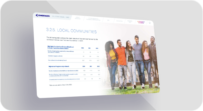 RELATÓRIO ANUAL / 2022 ABOUT FIT FOR GROWTH & ESG INNOVATION BUSINESS SUSUSSTTAINABILAINABILITITYY EMBRAER FINANCIAL PERFORMANCE UNIT INDICINDICAATTORORS S 3.2.5. LOCAL COMMUNITIES The following table shows the main results of the work carried out by the Instituto Embraer and Embraer Foundation in 2022. Highlights from Instituto Embraer (Brazil) and 2020 2021 2022 Embraer Foundation (United States) Number of organizations supported by Instituto Embraer 13 36 43 and Embraer Foundation Volunteers engaged worldwide 891 895 1296 Hours allocated to volunteering (hours) 6677 8145 5891 Highschool Program (only in Brazil) 2020 2021 2022 Number of graduates on both Embraer high schools since 2002 4120 4440 4760 Number of Embraer’s high school students accepted in public 80% 84% 75%* or private universities with a scholarship* University students awarded by the scholarship fund (cumulative) 768 768 768 *Data was calculated on March 30th, 2023. 124