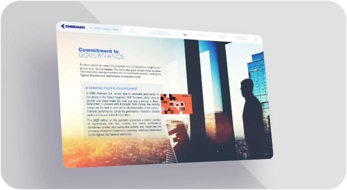 RELATÓRIO ANUAL / 2022 ABOUT FIT FOR GROWTH & ESESGG INNOVATION BUSINESS SUSTAINABILITY EMBRAER FINANCIAL PERFORMANCE UNIT INDICATORS Commitment to GOVERNANCE Embraer seeks to ensure the highest level of corporate integrity and ethics in all its businesses. The corporate governance model adopted has a business management focused on sustainable growth, meeting the highest Brazilian and international market standards. RANKING FIRST IN GOVERNANCE In 2022, Embraer S.A. ranked 昀椀rst in corporate governance in the survey of the Época Negócios 360º Yearbook, which aims to identify and disseminate the best business practices in Brazil. Conducted in concert with Fundação Dom Cabral, the ranking recognizes the best in each of the six dimensions of the survey – 昀椀nancial performance, corporate governance, innovation, people, sustainability, and vision for the future. The 2022 edition of the yearbook presented a record number of registrations, with four hundred and twenty participating companies divided into twenty-昀椀ve sectors, and recognized the company’s Corporate Governance practices, which are established to the highest international standards. 323232
