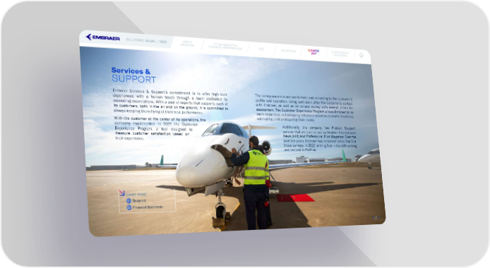 RELATÓRIO ANUAL / 2022 ABOUT FIT FOR GROWTH & ESG INNOVATION BUBUSINESINESSSS SUSTAINABILITY EMBRAER FINANCIAL PERFORMANCE UNITUNIT INDICATORS Services & SUPPORT Embraer Services & Support’s commitment is to offer high-tech The survey occurs in various formats and according to the customer’s experiences with a human touch through a team dedicated to pro昀椀le and operation, being sent soon after the customer’s contact exceeding expectations. With a pool of experts that supports each of with Embraer, as well as an annual survey with several pillars for its customers, both in the air and on the ground, it is committed to assessment. The Customer Experience Program allows Embraer to be always keeping them 昀氀ying at their best performance. more responsive in developing initiatives based on customer feedback, With the customer at the center of its operations, the estimating, and anticipating their needs. company implemented in 2022 the Customer Additionally, the company has Product Support Experience Program, a tool designed to surveys that are carried out by Aviation International measure customer satisfaction based on News (AIN) and Professional Pilot Magazine. Over the their experience. past ten years, Embraer has remained in the Top 3 of these surveys, in 2022 ranking 昀椀rst in the AIN ranking and second in ProPilot. Learn more: Research Financial Statements 6161