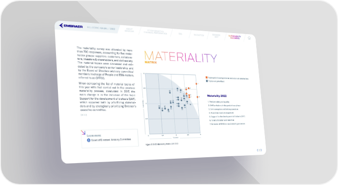 SUSTAINABILITY RELATÓRIO ANUAL / 2022 ABOUT FIT FOR GROWTH & ESG INNOVATION BUSINESS SUSTAINABILITY INDICATORS EMBRAER FINANCIAL PERFORMANCE UNIT INDICATORS The materiality survey was attended by more than 700 responses, accounting for 昀椀ve stake- holder groups: suppliers, customers, collabora- MATERIALITY tors, investors & shareholders, and civil society. MATRIX The material topics were discussed and vali- dated by the company’s senior leadership, and by the Board of Directors advisory committee’ 5 members in charge of People and ESG matters, Topics prioritized by internal and external stakeholders referred to as CPESG. Topics not prioritized 1 When comparing the list of material topics of this year with that carried out in the previous 4,5 4 3 materiality process, conducted in 2017, the 23 14 13 5 main change is in the inclusion of the topic 12 6 Materiality 2022 16 8 7 2 Support for the development of biofuels (SAF), 15 s 24 22 17 11 1. Product safety and quality which occurred both by prioritizing stakehol- eholder4 18 9 10 ak 29 19 2. GHG emissions in the product use phase ders and by strategically prioritizing Embraer’s t 27 S 20 executive committee. 28 25 21 3. Anti-corruption and bribery practices 26 4. Hazardous waste management (GRI 3-2) 5. Support for the development of biofuels (SAF) 3,5 6. Talent attraction and retention 7. Emission of GHG in manufacturing processes Learn more: 3 3,5 4 4,5 5 Board of Directors’ Advisory Committee Executivos Figure 2: 2022 Materiality Matrix (GRI 3-2) 72