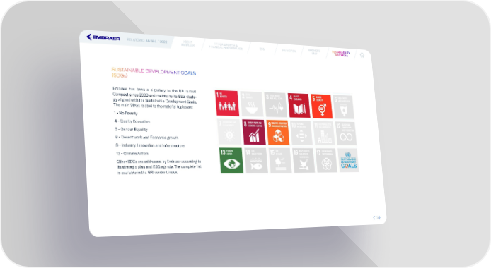 RELATÓRIO ANUAL / 2022 ABOUT FIT FOR GROWTH & ESG INNOVATION BUSINESS SUSUSSTTAINABILAINABILITITYY EMBRAER FINANCIAL PERFORMANCE UNIT INDICINDICAATTORORS S SUSTAINABLE DEVELOPMENT GOALS (SDGs) Embraer has been a signatory to the UN Global Compact since 2008 and maintains its ESG strate- gy aligned with the Sustainable Development Goals. The main SDGs related to the material topics are: 1 - No Poverty 4 - Quality Education 5 - Gender Equality 8 - Decent work and Economic growth 9 - Industry, Innovation and Infrastructure 13 - Climate Action Other SDGs are addressed by Embraer according to its strategic plan and ESG agenda. The complete list is available in the GRI content index. 73