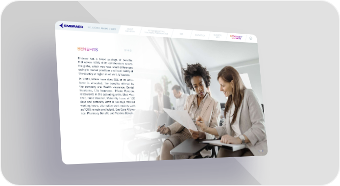 RELATÓRIO ANUAL / 2022 ABOUT FIT FOR GROWTH & ESG INNOVATION BUSINESS SUSUSSTTAINABILAINABILITITYY EMBRAER FINANCIAL PERFORMANCE UNIT INDICINDICAATTORORS S BENEFITS (GRI 401-2) Embraer has a broad package of bene昀椀ts that covers 100% of its collaborators across the globe, which may have small differences owing to market practices and local reality of the country or region in which it is located. In Brazil, where more than 85% of its work- force is allocated, the bene昀椀ts offered by the company are: Health Insurance, Dental Insurance, Life Insurance, Private Pension, restaurants in the operating units, Meal Vou- cher, Food Voucher, Maternity Leave of 180 days and paternity leave of 20 days, 昀氀exible working hours, alternative work models such as 100% remote and hybrid, Day Care Allowa- nce, Pharmacy Bene昀椀t, and Vaccine Bene昀椀t. 111111