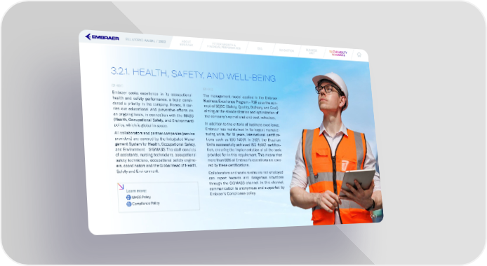 RELATÓRIO ANUAL / 2022 ABOUT FIT FOR GROWTH & ESG INNOVATION BUSINESS SUSUSSTTAINABILAINABILITITYY EMBRAER FINANCIAL PERFORMANCE UNIT INDICINDICAATTORORS S 3.2.1. HEALTH, SAFETY, AND WELL-BEING (GRI 403-1) (GRI 403-2) Embraer seeks excellence in its occupational The management model applied in the Embraer health and safety performance, a topic consi- Business Excellence Program - P3E uses the con- dered a priority in the company. Hence, it car- cept of SQDC (Safety, Quality, Delivery, and Cost) ries out educational and preventive efforts on aiming at the standardization and optimization of an ongoing basis, in connection with the MASS the company’s operational and cost indicators. (Health, Occupational Safety, and Environment) In addition to the criteria of business excellence, policy, which is global in scope. Embraer has maintained in its largest manufac- All collaborators and partner companies (service turing units, for 19 years, international certi昀椀ca- providers) are covered by the Integrated Mana- tions such as ISO 14001. In 2021, the Brazilian gement System for Health, Occupational Safety, Units successfully achieved ISO 45001 certi昀椀ca- and Environment – SIGMASS. The staff consists tion, ensuring the implementation of all the tools of assistants, nursing technicians, occupational provided for in this requirement. This means that safety technicians, occupational safety engine- more than 88% of Embraer’s operations are cove- ers, coordinators and the Global Head of Health, red by these certi昀椀cations. Safety and Environment. Collaborators and workers who are not employed can report hazards and dangerous situations through the SIGMASS channel. In this channel, Learn more: communication is anonymous and supported by MASS Policy Embraer’s Compliance policy. Compliance Policy 9090