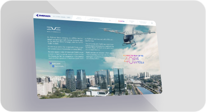 RELATÓRIO ANUAL / 2022 ABOUT FIT FOR GROWTH & ESG INNOINNOVVAATIONTION BUSINESS SUSTAINABILITY EMBRAER FINANCIAL PERFORMANCE UNIT INDICATORS An Embraer Group company for eVTOLs (vertical ca. FlyBIS will purchase up to 40 eVTOL vehi- takeoff and landing aircraft), Eve had its shares listed cles from Eve. on the New York Stock Exchange under the symbol The partnership with FlyBIS has made it pos- “EVEX” in 2022. sible to expand the future of air mobility to the In order to go public, Eve merged with Zanite, a spe- Southern Region of Brazil and to other coun- cial-purpose acquisition aviation company (SPAC). tries in South America. Eve also signed a letter of intent with FlyBIS, an ad- FlyBIS vehicles are included in Eve’s market- vanced air mobility startup based in Caxias do Sul, -leading backlog, which currently has an order FLYBIS TO BUY UP TO Rio Grande do Sul, for cooperation in the develop- backlog for up to two thousand seven hundred ment of eVTOL operations in Brazil and South Ameri- and seventy eVTOLs. EVE Learn more: 40eVTOLs Eve Air Mobility 4747
