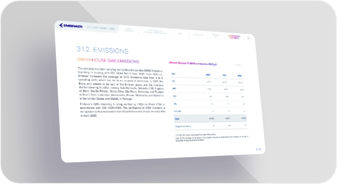 RELATÓRIO ANUAL / 2022 ABOUT FIT FOR GROWTH & ESG INNOVATION BUSINESS SUSUSSTTAINABILAINABILITITYY EMBRAER FINANCIAL PERFORMANCE UNIT INDICINDICAATTORORS S 3.1.2. EMISSIONS Direct (Scope 1) GHG emissions (tCO e) (GRI 305-1) GREENHOUSE GAS EMISSIONS 2 The company has been carrying out its Greenhouse Gas (GHG) Emissions Inventory in keeping with ISO 14064 Part I since 2009. From 2020 on, Gas 2020 2021 2022* Embraer increased the coverage of GHG Emissions data from 9 to 6 operating units, which has led to an increase in emissions. In 2022, the CO2 36721 38007 36504 Évora unit ceased to be part of the Embraer group, and the inventory started covering 15 unites, namely: Belo Horizonte, Botucatu, EDE, Eugênio HFC 5304 6497 4846 de Melo, Gavião Peixoto, Ozires Silva, São Paulo, Sorocaba, and Taubaté, in Brazil; Fort Lauderdale, Jacksonville, Macon, Melbourne, and Nashville, NO 251 266 230 2 in the United States, and OGMA, in Portugal. CH 16 17 19 Embraer’s GHG Inventory is being veri昀椀ed by LRQA do Brasil LTDA in 4 accordance with ISO 14064:2006. The veri昀椀cation of 2022 inventory is being taken with a reasonable level of con昀椀dence and should be completed PFC-218 0 0 0 in April 2023. Total 42292 44787 41599 Biogenic emissions 42 100 172 * In 2022, the Évora unit ceased to be part of the scope. Note: (i) The increase in emissions from biogenic sources is explained by the increase in the use of renewable energy sources by Embraer. 78