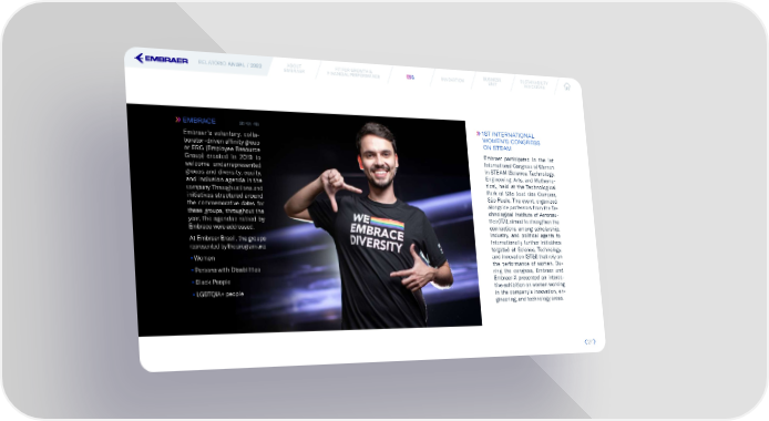RELATÓRIO ANUAL / 2022 ABOUT FIT FOR GROWTH & ESG BUSINESS SUSTAINABILITY EMBRAER FINANCIAL PERFORMANCE ESG INNOVATION UNIT INDICATORS EMBRACE GRI 404; 405 1ST INTERNATIONAL Embraer’s voluntary, colla- WOMEN’S CONGRESS borator -driven af昀椀nity group ON STEAM or ERG (Employee Resource Embraer participated in the 1st Group) created in 2019 to International Congress of Women welcome underrepresented in STEAM (Science, Technology, groups and diversity, equity, Engineering, Arts, and Mathema- and inclusion agenda in the tics), held at the Technological company. Through actions and Park of São José dos Campos, initiatives structured around São Paulo. The event, organized the commemorative dates for alongside professors from the Te- these groups, throughout the chnological Institute of Aeronau- year, the agendas raised by tics (ITA), aimed to strengthen the Embrace were addressed. connections among scholarship, At Embraer Brasil, the groups industry, and political agents to represented by the program are: internationally further initiatives targeted at Science, Technology, • Women and Innovation (ST&I) that rely on • Persons with Disabilities the performance of women. Du- ring the congress, Embraer and • Black People Embraer-X presented an interac- • LGBTQIA+ people tive exhibition on women working in the company’s innovation, en- gineering, and technology areas. 27