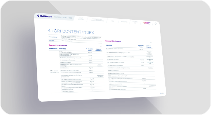 RELATÓRIO ANUAL / 2022 ABOUT FIT FOR GROWTH & ESG INNOVATION BUSINESS SUSUSSTTAINABILAINABILITITYY EMBRAER FINANCIAL PERFORMANCE UNIT INDICINDICAATTORORS S 4.1 GRI CONTENT INDEX EMBRAER – Empresa Brasileira de Aeronáutica S.A has reported the information cited Statement of use in this GRI content index for the period from 1 January 2022 to 31 December 2022 with reference to the GRI Standards General Disclosures GRI 2 GRI 1 used GRI 1: Foundation 2021 DISCLOSURE Sustainability Additional General Disclosures GRI 2 Report Reference(s) Sustainability Additional 2-16 Communication of critical concerns Page 131 GRI STANDARD DISCLOSURE Report Reference(s) Organizational 2-17 Collective knowledge of the highest governance body - Structure, 2-1 Organizational details Page 07 Nomintation and Training Policy 2-2 Entities included in the organization’s Page 70 sustainability reporting 2-18 Evaluation of the performance of the highest governance body - Internal Rules of the Board 2-3 Reporting period, frequency and contact point Page 70 Internal Rules of the 2-19 Remuneration policies Page 116 Board 2-4 Restatements of information Page 70 2-5 External assurance Page 70 2-20 Process to determine remuneration Page 117 Internal Rules of the Board 2-6 Activities, value chain and other business - Financial 2-21 Annual total compensation ratio Page 117 relationships Statements 2-7 Collaborators Page 110 2-22 Statement on sustainable development strategy - Sustainability GRI 2: General 2-8 Workers who are not collaborators Page 110 2-23 Policy commitments - Disclosures 2021 2-9 Governance structure and composition Page 127 2-24 Embedding policy commitments - 2-10 Nomination and selection of the highest - Nomination and governance body Training Policy 2-25 Processes to remediate negative impacts - 2-11 Chair of the highest governance body Page 129 2-26 Mechanisms for seeking advice and raising concerns Page 132 2-12 Role of the highest governance body in Page 130 2-27 Compliance with laws and regulations Page 136 overseeing the management of impacts 2-13 Delegation of responsibility for managing Page 131 2-28 Membership associations - impacts 2-14 Role of the highest governance body in Page 131 2-29 Approach to stakeholder engagement - Corporate Procedure sustainability reporting 2-15 Con昀氀icts of interest - 2-30 Collective bargaining agreements Page 96 151