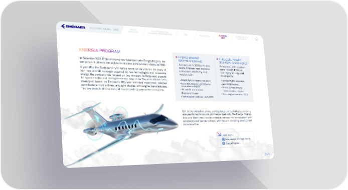 RELATÓRIO ANUAL / 2022 ABOUT FIT FOR GROWTH & ESG INNOVATION BUBUSINESINESSSS SUSTAINABILITY EMBRAER FINANCIAL PERFORMANCE UNITUNIT INDICATORS ENERGIA PROGRAM HYBRID ENERGY FUEL CELL POWER In December 2022, Embraer shared new advances in the Energia Program, the (E19-HE E E30-HE) (E19-H2FC E E30-H2FC) company’s initiative to zero pollutant emissions in the aviation industry by 2050. Announced in 2021 with nine Announced with nineteen seats, Embraer now explores seats in 2021, Embraer A year after the Sustainability in Action event, which unveiled the study of a nineteen and thirty-seat is studying a thirty-seat four new aircraft concepts powered by new technologies and renewable version with: version with: energy, the company has focused on two nineteen- to thirty-seat projects for hybrid electric and hydrogen-electric propulsion. The research has been • Parallel hybrid-electric propulsion • Hy drogen hybrid propulsion developed based on Embraer’s 昀椀fty-year technical experience, external • Up to 90% reduction of CO2 emis- • Zero CO2 Emissions contributions from airlines, and joint studies with engine manufacturers. sions when using SAF • 19- and 30-se at versions The two projects offer a real and feasible path to zero carbon emissions. • 19- and 30-se at versions • Electric motors at the rear • Engines a t the rear • Technological readiness – 2035 • Technological readiness – early 2030 Still in the evaluation phase, architectures and technologies are being analyzed for technical and commercial feasibility. The Energia Program Advisory Board was also launched to harness the contributions and collaboration of partner airlines, with the aim of making development more assertive. Learn more: New concept of Energia Family Energia Program 50