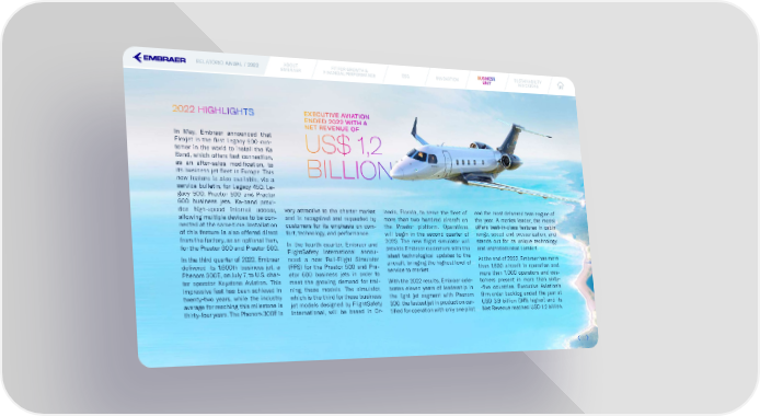 RELATÓRIO ANUAL / 2022 ABOUT FIT FOR GROWTH & ESG INNOVATION BUBUSINESINESSSS SUSTAINABILITY EMBRAER FINANCIAL PERFORMANCE UNITUNIT INDICATORS 2022 HIGHLIGHTS EXECUTIVE AVIATION ENDED 2022 WITH A NET REVENUE OF In May, Embraer announced that Flexjet is the 昀椀rst Legacy 500 cus- US$ 1,2 tomer in the world to install the Ka Band, which offers fast connection, as an after-sales modi昀椀cation, to its business jet 昀氀eet in Europe. This BILLION new feature is also available, via a service bulletin, for Legacy 450, Le- gacy 500, Praetor 500 and Praetor 600 business jets. Ka-band provi- des high-speed internet access, very attractive to the charter market lando, Florida, to serve the 昀氀eet of and the most delivered twin engine of allowing multiple devices to be con- and is recognized and requested by more than two hundred aircraft on the year. A market leader, the model nected at the same time. Installation customers for its emphasis on com- the Praetor platform. Operations offers best-in-class features in cabin of this feature is also offered direct fort, technology, and performance. will begin in the second quarter of range, speed and pressurization, and from the factory, as an optional item, In the fourth quarter, Embraer and 2023. The new 昀氀ight simulator will stands out for its unique technology for the Praetor 600 and Praetor 500. FlightSafety International annou- provide Embraer customers with the and unprecedented comfort. In the third quarter of 2022, Embraer nced a new Full-Flight Simulator latest technological updates to the At the end of 2022, Embraer has more delivered its 1,600th business jet, a (FFS) for the Praetor 500 and Pra- aircraft, bringing the highest level of than 1,600 aircraft in operation and Phenom 300E, on July 7, to U.S. char- etor 600 business jets in order to service to market. more than 1,000 operators and cus- ter operator Keystone Aviation. This meet the growing demand for trai- With the 2022 results, Embraer cele- tomers present in more than sixty- impressive feat has been achieved in ning these models. The simulator, brates eleven years of leadership in -昀椀ve countries. Executive Aviation’s twenty-two years, while the industry which is the third for these business the light jet segment with Phenom 昀椀rm order backlog ended the year at average for reaching this milestone is jet models designed by FlightSafety 300, the fastest jet in production cer- USD 3.9 billion (34% higher) and its thirty-four years. The Phenom 300E is International, will be based in Or- ti昀椀ed for operation with only one pilot Net Revenue reached USD 1.2 billion. 5252