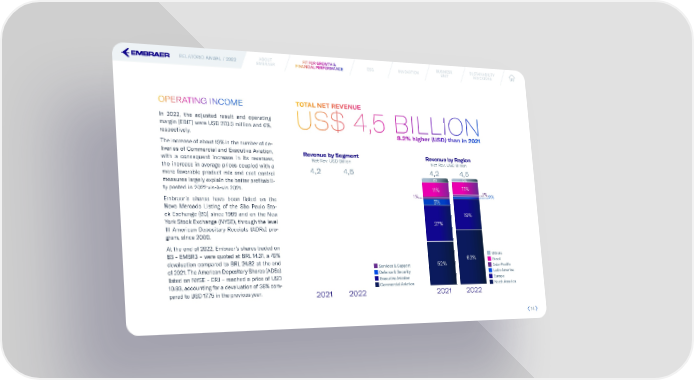 ABOUT FIT FOR GROWTH & BUSINESS SUSTAINABILITY RELATÓRIO ANUAL / 2022 FIT FOR GROWTH & ESG INNOVATION EMBRAER FINANCIAL PERFORMANCE UNIT INDICATORS FINANCIAL PERFORMANCE OPERATING INCOME TOTAL NET REVENUE In 2022, the adjusted result and operating margin (EBIT) were USD 270.3 million and 6%, US$ 4,5 BILLION respectively. 8.2% higher (USD) than in 2021 The increase of about 13% in the number of de- liveries of Commercial and Executive Aviation, Revenue by Segment Revenue by Region with a consequent increase in its revenues, Net Rev. USD Billion Net Rev. USD Billion the increase in average prices coupled with a 4,2 4,5 4,2 4,5 more favorable product mix and cost control 3% measures largely explain the better pro昀椀tabili- 4% ty posted in 2022 vis-à-vis 2021. 11% 11% 1% 1%2% Embraer’s shares have been listed on the 5% Novo Mercado Listing of the São Paulo Sto- ck Exchange (B3) since 1989 and on the New 19% York Stock Exchange (NYSE), through the level 27% III American Depositary Receipts (ADRs) pro- gram, since 2000. At the end of 2022, Embraer’s shares traded on B3 - EMBR3 – were quoted at BRL 14.31, a 42% 63% Others devaluation compared to BRL 24.82 at the end 52% Brazil of 2021. The American Depositary Shares (ADSs) Services & Support Asia-Paci昀椀c listed on NYSE - ERJ – reached a price of USD Defense & Security Latin America Executive Aviation Europe 10.93, accounting for a devaluation of 38% com- Commercial Aviation North America pared to USD 17.75 in the previous year. 2021 2022 2021 2022 14