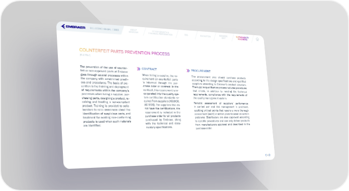 RELATÓRIO ANUAL / 2022 ABOUT FIT FOR GROWTH & ESG INNOVATION BUSINESS SUSUSSTTAINABILAINABILITITYY EMBRAER FINANCIAL PERFORMANCE UNIT INDICINDICAATTORORS S COUNTERFEIT PARTS PREVENTION PROCESS (RT-AE-250a.2) The prevention of the use of counter- CONTRACT PROCUREMENT feit or non-approved parts at Embraer goes through several processes within When hiring a supplier, the re- The procurement area should purchase products the company with established practi- quirement on counterfeit parts according to the design speci昀椀cations and quali昀椀ed ces and procedures. The basis of pre- is informed through the pur- suppliers according to Embraer’s product structure. vention is the training and deployment chase order or contract. In the The supplier quali昀椀cation process includes procedures of requirements within the company’s contract, this requirement is in- that check, in addition to meeting the technical processes when hiring a supplier, pur- corporated into the quality sys- requirements, compliance with the requirements of chasing parts, designing a product, re- tem certi昀椀cation standards re- the quality management system. ceiving and treating a non-compliant quired from suppliers (AS 9100, Periodic assessment of suppliers’ performance product. Training is provided to colla- AS 9120). For suppliers that do is carried out and risk management is practiced, borators to raise awareness about the not have the certi昀椀cations, the spotting critical points that require a more thorough identi昀椀cation of suspicious parts, and requirement is included in the assessment (audit) or action plans focused on certain treatment for existing non-conforming purchase order for all products problems. Distributors are also approved according products is used when such materials purchased by Embraer, along to speci昀椀c procedures and can only deliver products are identi昀椀ed. with the technical and docu- from manufacturers approved and described in the mentary speci昀椀cations. purchase order. 148