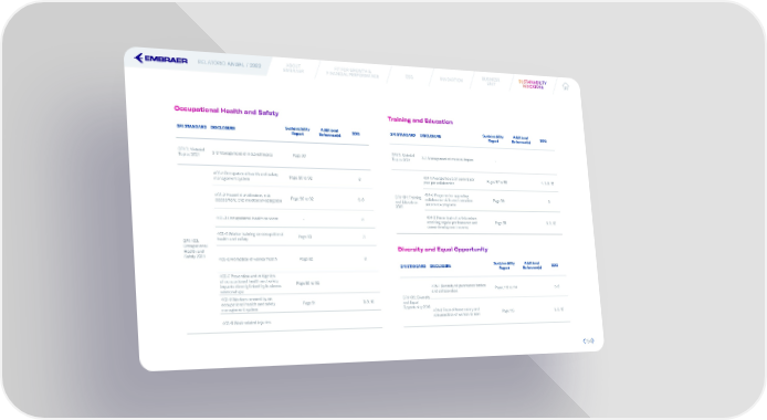 RELATÓRIO ANUAL / 2022 ABOUT FIT FOR GROWTH & ESG INNOVATION BUSINESS SUSUSSTTAINABILAINABILITITYY EMBRAER FINANCIAL PERFORMANCE UNIT INDICINDICAATTORORS S Occupational Health and Safety Training and Education GRI STANDARD DISCLOSURE Sustainability Additional SDG GRI STANDARD DISCLOSURE Sustainability Additional SDG Report Reference(s) Report Reference(s) GRI 3: Material GRI 3: Material 3-3 Management of material topics - Topics 2021 3-3 Management of material topics Page 90 Topics 2021 403-1 Occupational health and safety Page 90 to 92 8 404-1 Average hours of training per Pages 97 to 98 4, 5, 8, 10 management system year per collaborator GRI 404: Training 404-2 Programs for upgrading 403-2 Hazard identi昀椀cation, risk Page 90 to 92 3, 8 collaborator skills and transition Page 99 8 assessment, and incident investigation and Education assistance programs 2016 403-3 Occupational health services - 8 404-3 Percentage of collaborators receiving regular performance and Page 98 5, 8, 10 career development reviews 403-5 Worker training on occupational Page 93 3 GRI 403: health and safety Occupational Diversity and Equal Opportunity Health and Safety 2018 403-6 Promotion of worker health Page 92 8 GRI STANDARD DISCLOSURE Sustainability Additional SDG Report Reference(s) 403-7 Prevention and mitigation of occupational health and safety Page 90 to 92 impacts directly linked by business 405-1 Diversity of governance bodies relationships and collaborators Pages 112 to 114 5, 8 403-8 Workers covered by an GRI 405: Diversity occupational health and safety Page 91 3, 8, 16 and Equal management system Opportunity 2016 405-2 Ratio of basic salary and Page 115 5, 8, 10 403-9 Work-related injuries remuneration of women to men 154