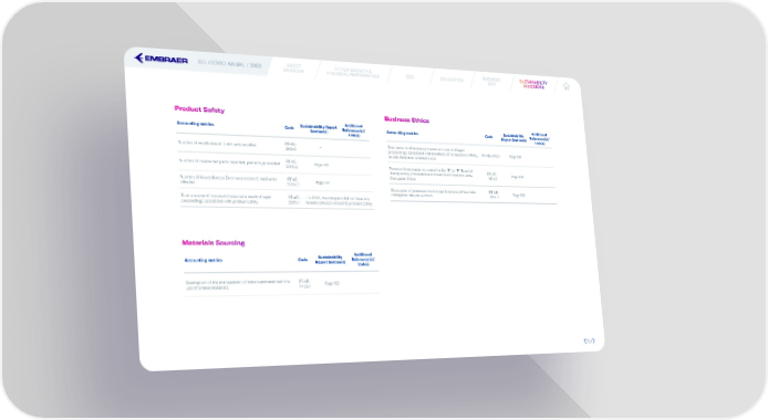 RELATÓRIO ANUAL / 2022 ABOUT FIT FOR GROWTH & ESG INNOVATION BUSINESS SUSUSSTTAINABILAINABILITITYY EMBRAER FINANCIAL PERFORMANCE UNIT INDICINDICAATTORORS S Product Safety Business Ethics Sustainability Report Additional Sustainability Additional Accounting metrics Code Section(s) Reference(s)/ Accounting metrics Code Report Section(s) Reference(s)/ Link(s) Link(s) Number of recalls issued, total units recalled RT-AE- - Total amount of monetary losses as a result of legal 250a.1 proceedings associated with incidents of corruption, bribery, RT-AE-510a.1 Page 135 and/or illicit international trade Number of counterfeit parts detected, percentage avoided RT-AE- Page 148 250a.2 Revenue from countries ranked in the “E” or “F” Band of RT-AE- Transparency International’s Government Defence Anti- 510a.2 Page 136 Corruption Index Number of Airworthiness Directives received, total units RT-AE- Page 147 affected 250a.3 Discussion of processes to manage business ethics risks RT-AE- Page 136 throughout the value chain 510a.3 Total amount of monetary losses as a result of legal RT-AE- In 2022, the company did not have any proceedings associated with product safety 250a.4 monetary losses related to product safety. Materials Sourcing Sustainability Additional Accounting metrics Code Report Section(s) Reference(s)/ Link(s) Description of the management of risks associated with the RT-AE- Page 122 use of critical materials 440a.1 157