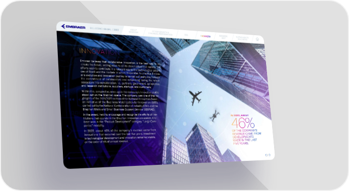 RELATÓRIO ANUAL / 2022 ABOUT FIT FOR GROWTH & ESG INNOINOVVAAÇTIONÃO BUSINESS SUSTAINABILITY EMBRAER FINANCIAL PERFORMANCE UNIT INDICATORS INNOINNOVVAATIONTION Embraer believes that collaborative innovation is the best way to co- -create the future, adding value to all its stakeholders and society. The efforts seek to contribute in a relevant way to the technological advan- ces of Brazil and the markets in which it operates. In practice, Embra- er’s evolution and innovation journey is carried out every day through the commitment of collaborators and networking taking the whole ecosystem into consideration, i.e., partners, government, universities and research institutions, suppliers, startups, and customers. Within this perspective, once again the company’s innovative pro昀椀le stood out on the Brazilian scene. The company was one of the hi- ghlights of the 2021/2022 edition of the National Innovation Award, an initiative of the Business Mobilization for Innovation (MEI), carried out by the National Confederation of Industry (CNI), and the Brazilian Micro and Small Business Support Service (SEBRAE). In the award, held to encourage and recognize the efforts of ins- IN 2022, ABOUT titutions that operate in the Brazilian innovation ecosystem, Em- braer won in the “Product Development” category, “Large Com- panies” modality. 46% In 2022, about 46% of the company’s revenue came from OF THE COMPANY’S innovations that occurred over the last 昀椀ve years. Investment REVENUE CAME FROM in technological development and innovation remained stable, DEVELOPMENTS on the order of 5% of annual revenue. MADE IN THE LAST FIVE YEARS. 373737