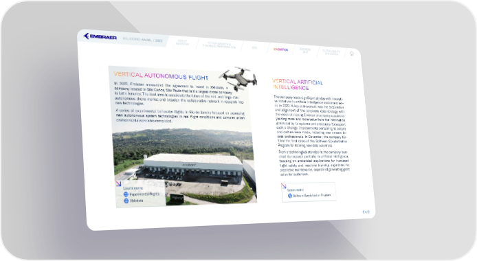 RELATÓRIO ANUAL / 2022 ABOUT FIT FOR GROWTH & ESG INNOINNOVVAATIONTION BUSINESS SUSTAINABILITY EMBRAER FINANCIAL PERFORMANCE UNIT INDICATORS VERTICAL AUTONOMOUS FLIGHT VERTICAL ARTIFICIAL In 2022, Embraer announced the agreement to invest in XMobots, a INTELLIGENCE company located in São Carlos, São Paulo that is the largest drone company The company made signi昀椀cant strides with innovati- in Latin America. The deal aims to accelerate the future of the mid- and large-size ve initiatives in arti昀椀cial intelligence and data scien- autonomous drone market and broaden the collaborative network in research into ce in 2022. A key achievement was the preparation new technologies. and alignment of the corporate data strategy with A series of experimental helicopter 昀氀ights in Rio de Janeiro focused on assessing the vision of making Embraer a company capable of new autonomous system technologies in real 昀氀ight conditions and complex urban yielding more and more value from the information environments were also completed. generated by its systems and processes. To support such a change, improvements pertaining to people and culture were made, including new careers for data professionals. In December, the company ful- 昀椀lled the 昀椀rst class of the Software Specialization Program for training new data scientists. From a technological standpoint, the company laun- ched its research portfolio in arti昀椀cial intelligence, focusing on embedded applications for increased 昀氀ight safety and machine learning algorithms for predictive maintenance, capable of generating great value for customers. Learn more: Experimental Flights Learn more: XMobots Software Specialization Program 42