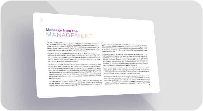Message from the MANAGEMENT Francisco Gomes Neto The year 2022 was marked by overcoming the challenges and uncertainties that have ari- family, as well as in Executive Aviation and the Defense area. Moreover, the diversi昀椀cation sen on several fronts: the war in Ukraine, increased global in昀氀ation, and broad restrictions of business areas helped to compensate for the performance of a speci昀椀c segment. In this on the supply chain. These challenges led us to adjust internal processes throughout the way, the good performance of the Services & Support and Executive Aviation areas, as well year and, thanks to the focus and discipline of the entire team in the accomplishment of our as the increase in deliveries in Commercial Aviation, helped to offset the impact in the strategic plan, we were able to deliver the goals planned for the year. Defense & Security area. Compared to 2021, we increased aircraft delivery by 12.7% – from 141 to 159 Commercial At Commercial Aviation, we announced an additional order for Canada’s Porter Airlines and Executive aircraft in 2022. We also increased revenue by 8.2% to USD 4.5 billion. Ad- for 20 new E195-E2s, in addition to 30 existing 昀椀rm orders. Porter even took delivery of the justed EBIT and EBITDA margin (in USD) exceeded the guidance presented to the market, 昀椀rst E195-E2 jets operating in North America at the end of the year. We also announced an reaching 6.0% and 10.1%. Another highlight was free cash generation without EVE, which order from Azorra, a U.S. aircraft leasing company, for 20 new E2 jets, besides the expansion reached USD 540.1 million, quite above estimates. of our presence in the Middle East, with operator SalamAir from Oman ordering six E2s. The focus on improving business ef昀椀ciency remains a key factor in achieving our goals In addition, the Chinese civil aviation authority has granted certi昀椀cation for our E190-E2, and delivering better margins, even with supply chain constraints. Throughout the year, opening the doors of the relevant Chinese market for the E2 family. we implemented several mitigation measures, such as creating a special team to operate Executive Aviation presented another year with outstanding results, with the delivery of 102 within the main suppliers’ plants, developing alternative logistics routes, and improving aircraft, “book-to-bill2” above 1.8:1, and a higher gross margin than in the previous year. As internal processes to reduce production cycles. Also noteworthy are the efforts for con- a re昀氀ection of the good momentum of the business unit, Phenom 300 was voted for the 11th tinuous improvement of operational ef昀椀ciency, such as inventory turnover management, consecutive year as the world’s best-selling business jet in the industry. restructuring of selection and procurement processes, and ongoing improvement of pro- In Defense, we faced dif昀椀culties such as contract renegotiation and other factors that re- duction processes. sulted in a 25% decrease in segment revenue. However, we are optimistic for 2023 as the The sales growth of our current product portfolio also excites us for the coming years. The current geopolitical scenario continues to in昀氀uence countries around the world to review backlog returned to the pre-pandemic level, reaching USD 17.5 billion. There are several their plans and renew their armed forces. The main highlight of the year was the selection ongoing sales campaigns that are progressing, both in Commercial Aviation, mainly the E2 of C-390 Millennium by the Dutch Ministry of Defense as the only aircraft that meets the