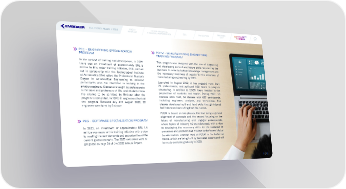 RELATÓRIO ANUAL / 2022 ABOUT FIT FOR GROWTH & ESG INNOVATION BUSINESS SUSUSSTTAINABILAINABILITITYY EMBRAER FINANCIAL PERFORMANCE UNIT INDICINDICAATTORORS S PEE – ENGINEERING SPECIALIZATION PCEM – MANUFACTURING ENGINEERING PROGRAM TRAINING PROGRAM In the context of training and development, in 2022 This program was designed with the aim of diagnosing there was an investment of approximately BRL 5 and developing current and future skills required by the million in this major training initiative. PEE, carried business in order to further knowledge management and out in partnership with the Technological Institute the necessary readiness of people for the advances of of Aeronautics (ITA), offers the Professional Master’s manufacturing engineering by 2025. Degree in Aeronautical Engineering to selected Launched in August 2022, it has engaged more than participants who are interested in working in the 70 professionals, and achieved 500 hours in program aviation segment. Classes are taught by professionals structuring, in addition to 2,000 hours invested in the of Embraer and professors of ITA, and students have preparation of contents and tracks. During 2022, 50 the chance to be admitted by Embraer after the courses were held, 34 classes with 887 participants, program is completed. In 2022, 61 engineers attended including engineers, analysts, and technicians. The the program. Between July and August 2022, 22 classes developed soft and hard skills through internal engineers were hired by Embraer. facilitators and consulting from the market. PCEM is based on two phases, the 昀椀rst being a general alignment of concepts and the second focusing on the PES – SOFTWARE SPECIALIZATION PROGRAM future of manufacturing and engaged professionals, where topics of industry 4.0 are addressed, with a view In 2022, an investment of approximately BRL 1.4 to developing the necessary skills for the evolution of million was made in this training initiative, with a view processes and practices and mindset in the face of digital to meeting the new demands and opportunities of the transformation. Another front of PCEM is the technical current global scenario. The 2022 outcomes were hi- tracks, which are being built by dedicated experts and will ghlighted on page 23 of the 2022 Annual Report. be made available gradually in 2023. 104