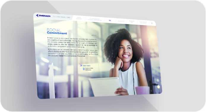 RELATÓRIO ANUAL / 2022 ABOUT FIT FOR GROWTH & ESESGG INNOVATION BUSINESS SUSTAINABILITY EMBRAER FINANCIAL PERFORMANCE UNIT INDICATORS SOCIAL Commitment GRI 405; 3-3 Embraer seeks to be a plural and human company that respects the individualities of each collaborator. Valuing characteristics and behaviors, the company praises that every human being is part of a process, and always seeks to offer the necessary support for its collaborators to perform their assignments with a sense of belonging. With a focus on the inclusion and representativeness of all people, and efforts directed at minority or underrepresented groups to be part of the company in a genuine way, Embraer has corporate goals for Diversity & Inclusion and makes this a cornerstone of its culture. Learn more: Sustainability Indicators 212121