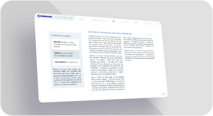 RELATÓRIO ANUAL / 2022 ABOUT FIT FOR GROWTH & ESESGG INNOVATION BUSINESS SUSTAINABILITY EMBRAER FINANCIAL PERFORMANCE UNIT INDICATORS GATEWAYS, INTERNSHIPS, AND YOUNG APPRENTICES GRI 404; 405; 3-3 WORKING MODELS In 2022, Embraer’s Internship Program 昀椀lled 昀椀ve Overall, forty collaborators attended Data Scien- hundred vacancies in two cycles and is expected ces subjects, and 昀椀fty-one collaborators took the to 昀椀ll another three hundred vacancies in the 昀椀rst subjects on Embedded Software. In December ON-SITE: Five days in person half of 2023, with a new cycle of applications 2022, the class was concluded with the approval (productive areas and production for candidates from all over Brazil. In addition, of the thirty-昀椀ve professionals, thirty-three of support) the Summer Internship was also launched, with whom were hired by Embraer. thirty vacancies and a duration of two and a half Embraer’s goal is to draw the new generation of months with opportunities in several areas, and in aviation talent and provide candidates with great HYBRID: On-site + Remote face-to-face, hybrid, or 100% remote work models. convenience and experiences, in a diverse and (up to two days in person) Embraer, in concert with Senai (National Service inclusive environment, so that each professional for Industrial Training) for young apprentices, becomes the main player in their own development opened new classes in 2022, with about two and career. 100% REMOTE: Five days remote hundred participants in the São Paulo cities of Gavião Peixoto, Botucatu, and São José dos Campos. It also maintained the partnership for Based on these three models, the FORMARE, a professional quali昀椀cation program company tested and validated the aimed at young people in situations of economic foundations of Future of Work, such as and social vulnerability, earmarked for logistics updating employment agreements, how students in the city of Gavião Peixoto. to offer infrastructure services such Also in 2022, the 昀椀rst class of the Software as food and transportation, as well as Specialization Program – PES was formed. Held issues of home-of昀椀ce allowance and in partnership with UFPE (Federal University of assistance during the pandemic. Pernambuco), this is a Non-Degree Graduation Program in Embedded Software and Data Science, with subjects taught by professors from UFPE and with the participation of Embraer professionals. 23