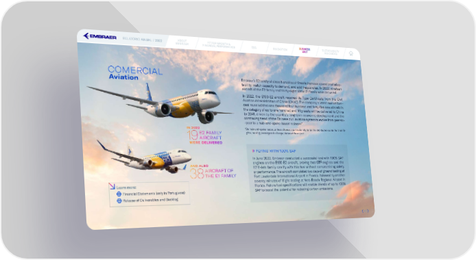 RELATÓRIO ANUAL / 2022 ABOUT FIT FOR GROWTH & ESG INNOVATION BUBUSINESINESSSS SUSTAINABILITY EMBRAER FINANCIAL PERFORMANCE UNITUNIT INDICATORS COMERCIAL Aviation Embraer’s E2 family of aircraft enables airlines to increase operational adap- tability, match capacity to demand, and add frequencies. In 2022, nineteen aircraft of the E2 family and thirty-eight of the E1 family were delivered. In 2022, the E190-E2 aircraft received its Type Certi昀椀cate from the Civil Aviation Administration of China (CAAC). The company’s latest market fore- cast revealed that one thousand four hundred and forty-昀椀ve new aircraft in the category of up to one hundred and 昀椀fty seats will be delivered to China by 2041, driven by the country’s long-term economic development and the continuing trend of the Chinese civil aviation system to evolve from peer-to- -peer to a hub-and-spoke-based network*. IN 2022 * On hub-and-spoke routes, airlines choose a particular city to be the distribution center for their 昀氀i- E2 FAMILY ghts, causing passengers to change planes at the airport. 19AIRCRAFT WERE DELIVERED FLYING WITH 100% SAF In June 2022, Embraer conducted a successful test with 100% SAF AND ALSO engines on the E195-E2 aircraft, proving that GTF engines and the AIRCRAFT OF E2 E-Jets family can 昀氀y with this fuel without compromising safety 38THE E1 FAMILY or performance. The aircraft completed two days of ground testing at Fort Lauderdale International Airport in Florida, followed by another seventy minutes of 昀氀ight testing at Vero Beach Regional Airport in Learn more: Florida. Future fuel speci昀椀cations will enable blends of up to 100% Financial Statements (only in Portuguese) SAF to boost the potential for reducing carbon emissions. Release of Deliverables and Backlog 494949