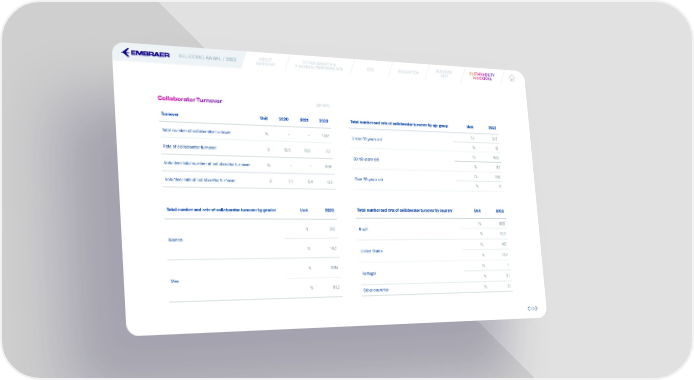 RELATÓRIO ANUAL / 2022 ABOUT FIT FOR GROWTH & ESG INNOVATION BUSINESS SUSUSSTTAINABILAINABILITITYY EMBRAER FINANCIAL PERFORMANCE UNIT INDICINDICAATTORORS S Collaborator Turnover (GRI 401-1) Turnover Unit 2020 2021 2022 Total number and rate of collaborator turnover by age group Unit 2022 Total number of collaborator turnover N. - - 1347 N. 243 Under 30 years old % 18 Rate of collaborator turnover % 19,5 10,6 8,1 N. 902 30-50 years old Volunteer total number of collaborator turnover N. - - 956 % 67 N. 202 Volunteer rate of collaborator turnover % 3,1 5,4 6,0 Over 50 years old % 15 Total number and rate of collaborator turnover by gender Unit 2022 Total number and rate of collaborator turnover by country Unit 2022 N. 888 N. 245 Brazil % 65,9 Women % 18,2 N. 427 United States % 31,7 N. 1094 N. 1 Men Portugal % 0,1 % 81,2 Other countries N. 31 108